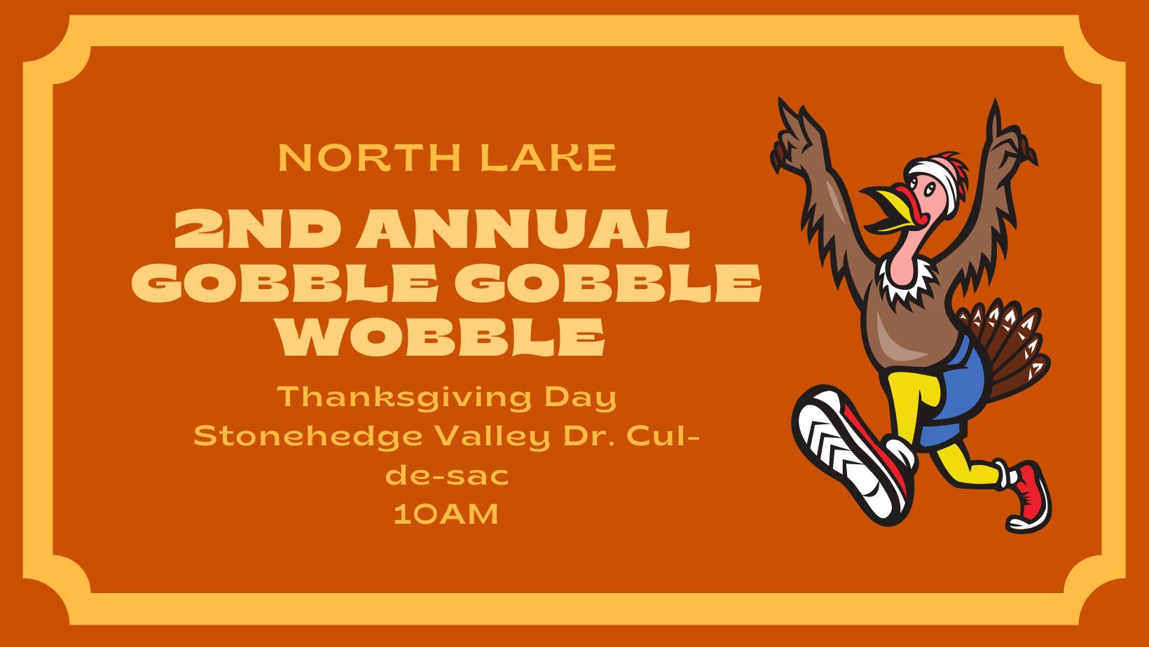 Stonehedge Valley Dr. Cul-De-SacBack by popular demand!!!! North Lake neighbors can once again RUN THE RACE BEFORE YOU STUFF YOUR FACE!! The starting line will be at the Stonehedge Valley Drive Cul-de-Sac forboth…